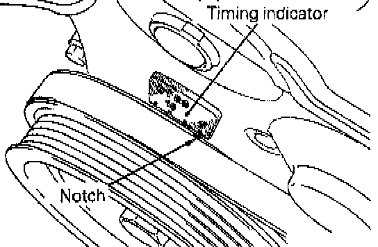 9. Turn the crankshaft through 36O° to line up the notch on the crankshaft pulley with the "T" mark on the timing indicator.