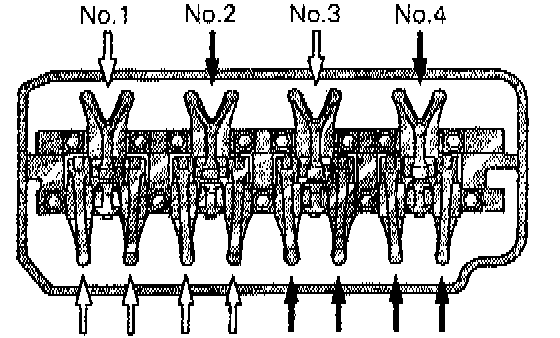 5. Move the rocker arms on the No.1 and No.4 cylinders up and down by hand to determine which cylinder has its piston at the top dead center on the compression stroke.