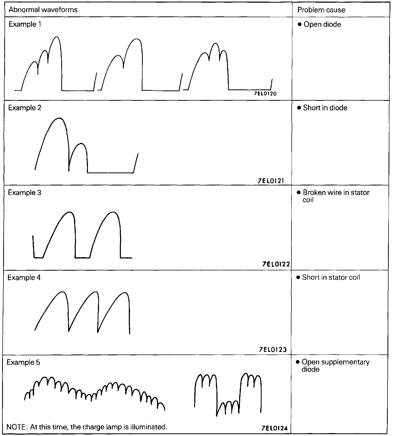 2. Identification of abnormal waveforms is easier when there is a large output current (regulator is not operating). (Waveforms can be observed when the headlamps are illuminated.)