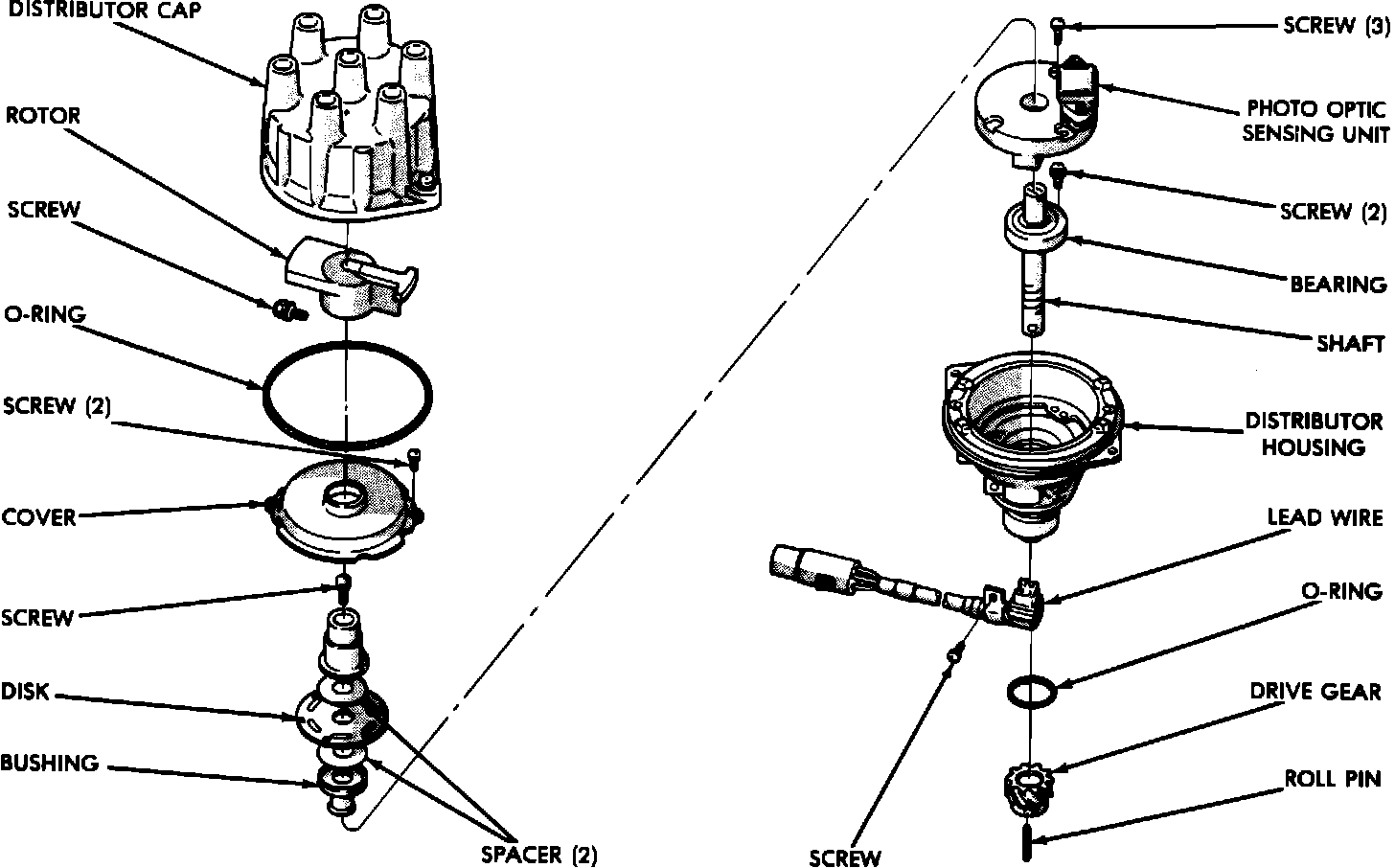 The Optical Distributor sends engine speed and crankshaft position signals to the Powertrain Control Module (PCM). These signals are used to control ignition timing, fuel injection, and idle speed. SEE IGNITION PICK-UP (OPTICAL) OPERATION.