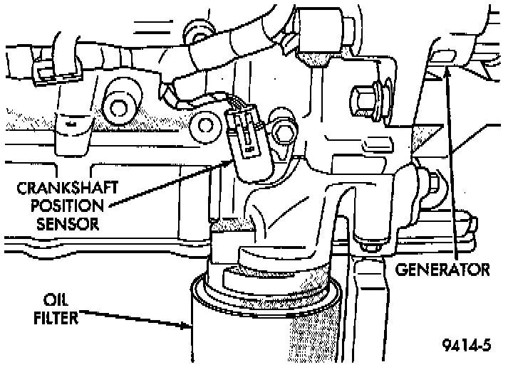 The crankshaft position sensor mounts to the engine block behind the generator, just above the oil filter (Fig. 9).