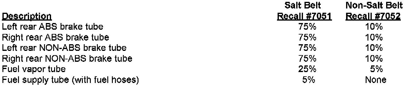 ^ Each involved dealer, to whom vehicles in the recall were invoiced, will receive enough Retainer Clip Packages to service 100% of those vehicles. In addition, enough of the tube packages will be distributed to service the referenced percentage of those vehicles as shown.