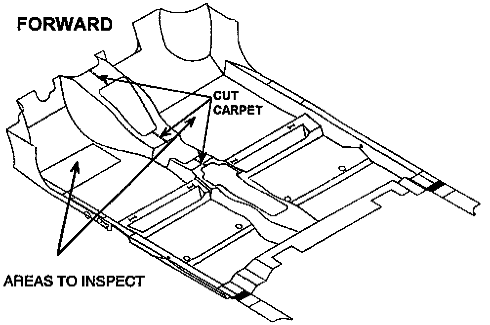 4. Obtain a new carpet as called out in the parts section. Before installing the new carpet, it will be necessary to cut the replacement carpet along the mold line on the underside of the tunnel formation and in the areas of the shifter and shifter cables.