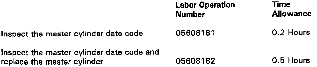 The ABS brake master cylinder rear seal may allow air ingestion into the cylinder and cause spongy brake feel or partial brake system loss. To correct this condition, the build date code of the master cylinder must be inspected and all master cylinders having a date code of 3309 and earlier must be replaced.