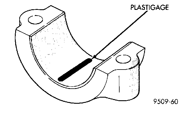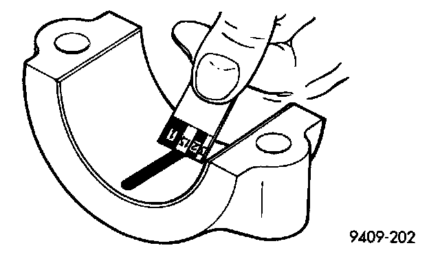 3. Place a piece of Plastigage across the entire width of the bearing shell in the bearing cap approximately 6.35 mm (1/4 inch.) off center and away from the oil hole. In addition, suspect areas can be checked by placing plastigage in the suspect area.
