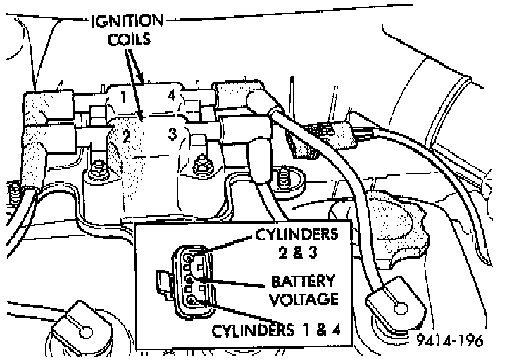 3. Connect a test light to the B+ (battery voltage) terminal of the coil electrical connector and ground. The center terminal of the connector supplies battery voltage. Refer to the Wiring Diagrams in group 8W.