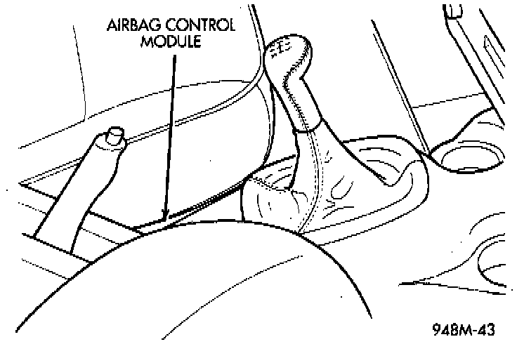 The Airbag Control Module (ACM) contains the safing sensor and energy reserve capacitor. The safing sensor is located inside the ACM. The module is mounted on the tunnel/floor pan between the gear shift lever and the park brake lever. The safing sensor provides confirmation of a crash, but does not discriminate severity. The ACM monitors the system to determine the system readiness. The ACM will store sufficient energy to deploy the airbags for at least one second after the battery is disconnected. The ACM contains on-board diagnostics, and will illuminate the AIRBAG warning lamp in the cluster when a fault occurs. The warning equipment is tested for six to eight seconds every time the vehicle is started.