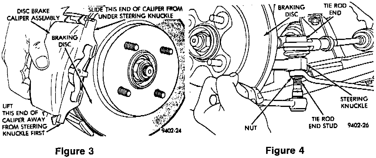 6. Remove the disc brake caliper assembly from the steering knuckle. The caliper is removed by first lifting the bottom of the caliper away from the steering knuckle, then removing the top of the caliper out from under the steering knuckle (Refer to Figure 3).