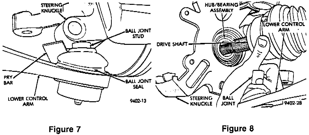 12. Separate the ball joint stud from the steering knuckle by prying down on the lower control arm (Refer to Figure 7). USE CAUTION WHEN SEPARATING THE BALL JOINT FROM THE STEERING KNUCKLE SO THE BALL JOINT SEAL IS NOT DAMAGED.