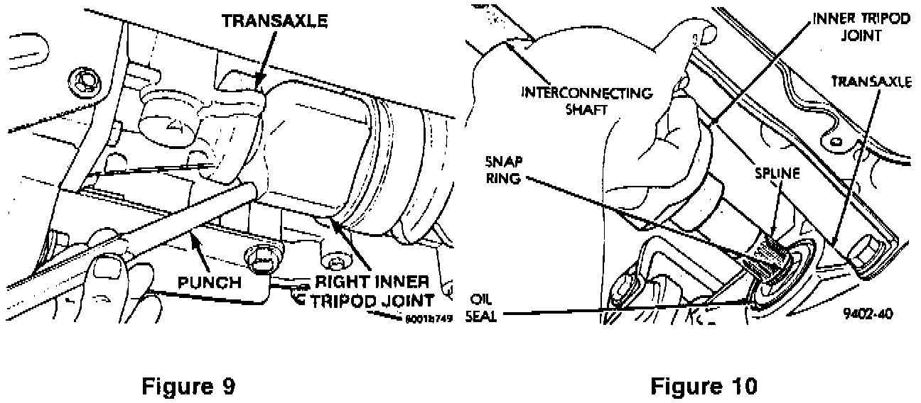 15. Remove the driveshaft from the transaxle side gear by placing a brass drift/punch against the inner tripod joint and hitting it sharply to dislodge the snap ring (Refer to Figure 9).