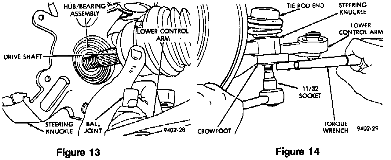22. Align the splines of the driveshaft C/V joint and the hub, then slide the shaft into the hub. Install the steering knuckle onto the ball joint stud (Refer to Figure 13).