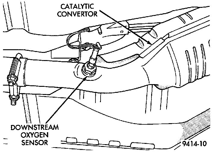 The downstream heated oxygen sensor threads into the outlet pipe at the rear of the catalytic convertor (Fig. 12). The downstream heated oxygen sensor input is used to detect catalytic convertor deterioration. As the convertor deteriorates, the input from the downstream sensor begins to match the upstream sensor input except for a slight time delay. By comparing the downstream heated oxygen sensor input to the input from the upstream sensor, the PCM calculates catalytic convertor efficiency.