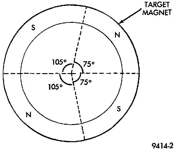 The camshaft position sensor attaches to the rear of the cylinder head. A target magnet attaches to the rear of the camshaft and indexes to the correct position. The target magnet has four different poles arranged in an asymmetrical pattern (Fig. 5). As the target magnet rotates, the camshaft position sensor senses the change in polarity (Fig. 6). The sensor output switch switches from high (5.0 volts; to low (0.5 volts) as the target magnet rotates. When the north pole of the target magnet passes under the sensor, the output switches high. The sensor output switches low when the south pole of the target magnet passes underneath.