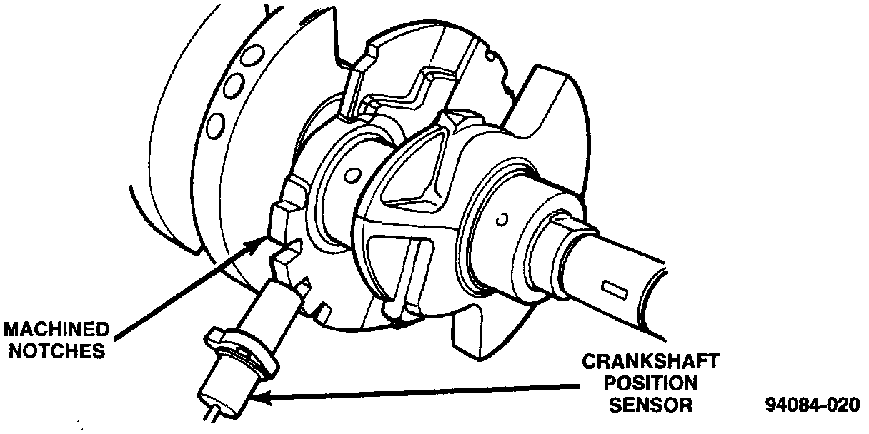 The PCM determines what cylinder to fire from the crankshaft position sensor input and the camshaft position sensor input. The second crankshaft counterweight has two sets of four timing reference notches including a 60 degree signature notch (Fig. 7). From the crankshaft position sensor input the PCM determines engine speed and crankshaft angle (position).