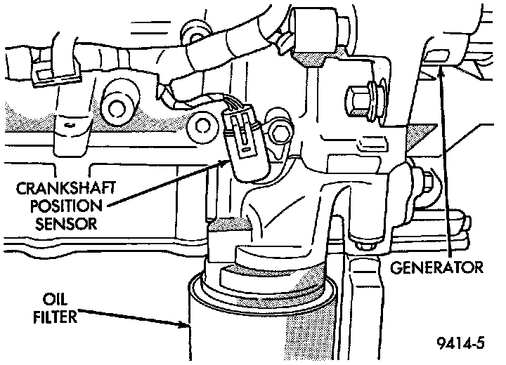 The crankshaft position sensor mounts to the engine block behind the alternator, just above the oil filter (Fig. 8).