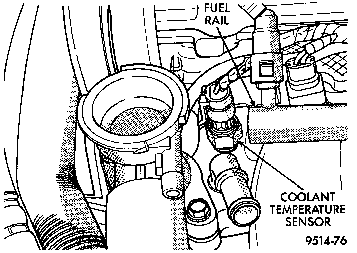 The coolant sensor threads into the intake manifold next to the thermostat housing (Fig. 10). New sensors have sealant applied to the threads.