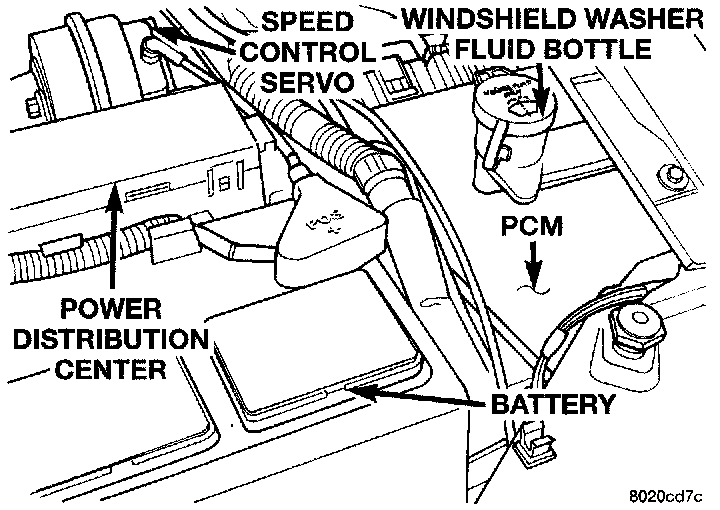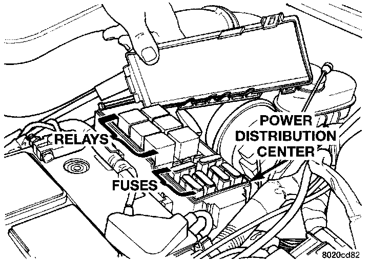 The power distribution center (PDC) is located next to the battery (Fig. 1). The PDC contains the starter relay radiator fan relay, A/C compressor clutch relay, auto shutdown relay, fuel pump relay and several fuses.