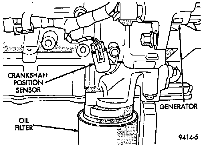 The crankshaft position sensor mounts to the engine block behind the generator, just above the oil filter (Fig. 15).
