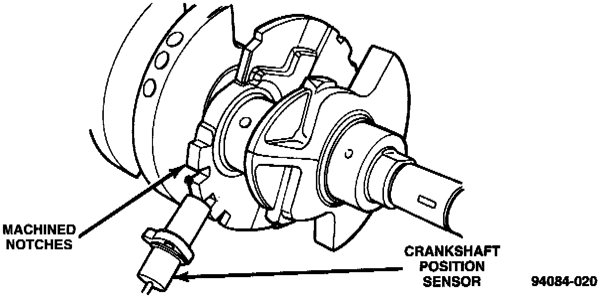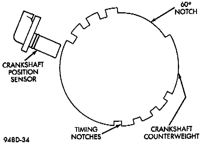 The timing reference notches are machined at 20° increments. From the voltage pulse-width the PCM tells the difference between the timing reference notches and the 60° signature notch.