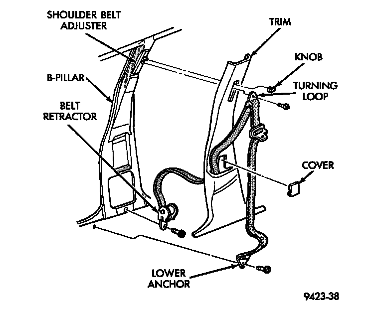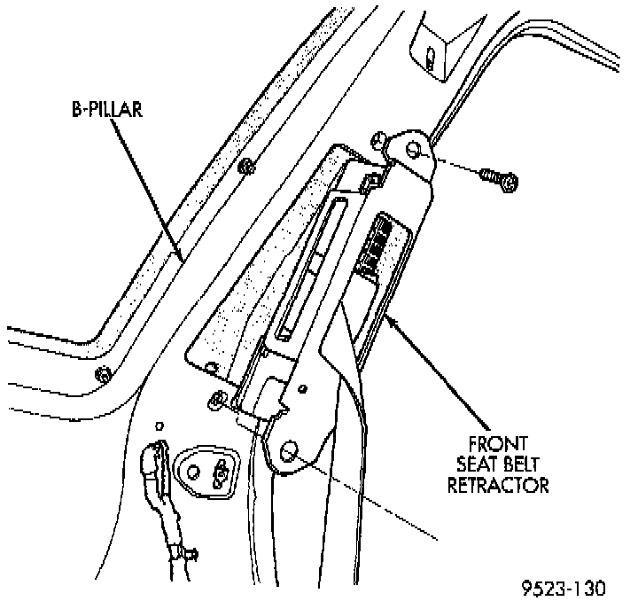 8. Remove bolts holding seat belt retractor to B-pillar.