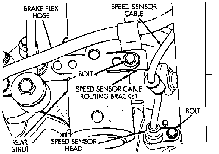 2. On models equipped with ABS, remove the retaining bolt, then the speed sensor. If speed sensor is seized, do not use pliers to remove. Gently tap on mounting ear with a suitable punch and hammer to loosen sensor.