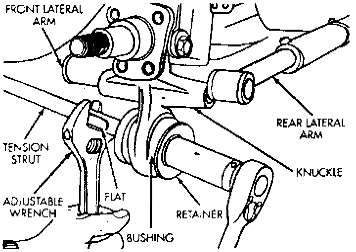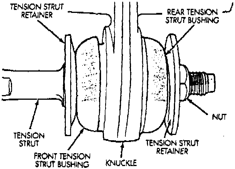 5. Remove lateral link to knuckle bolt, then using a suitable adjustable wrench to prevent tension strut from turning, remove tension strut nut, washer and bushing.