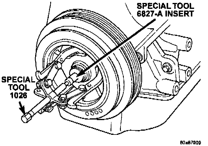 3. Remove crankshaft damper bolt. Remove damper using the large side of Special Tool 1026 and insert 6827-A. or equivalents.