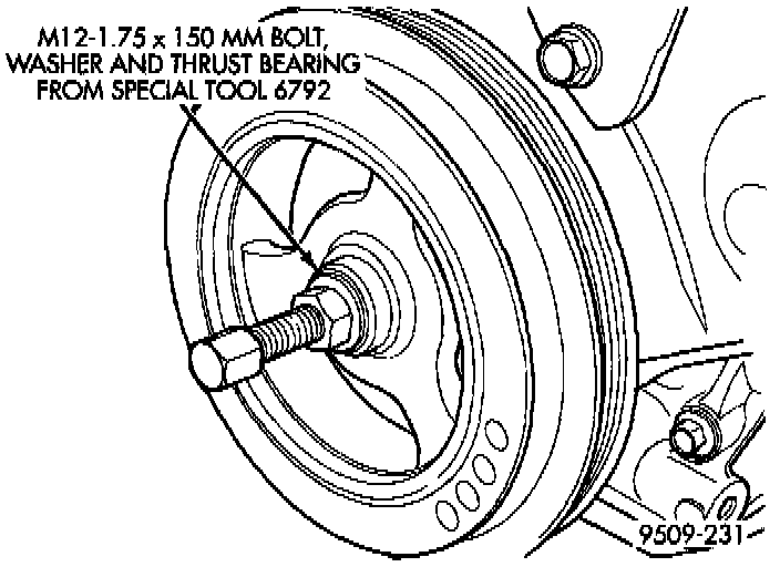 1. Install crankshaft damper using M12-1.75 x 150 mm bolt, washer, thrust bearing and nut from Special Tool 6792, or equivalent. Install crankshaft damper bolt and tighten to 142 Nm (105 ft. lbs.).