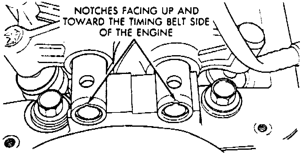 a. Install rocker arm and shaft assemblies with notches on shafts facing up and toward timing belt side of engine.