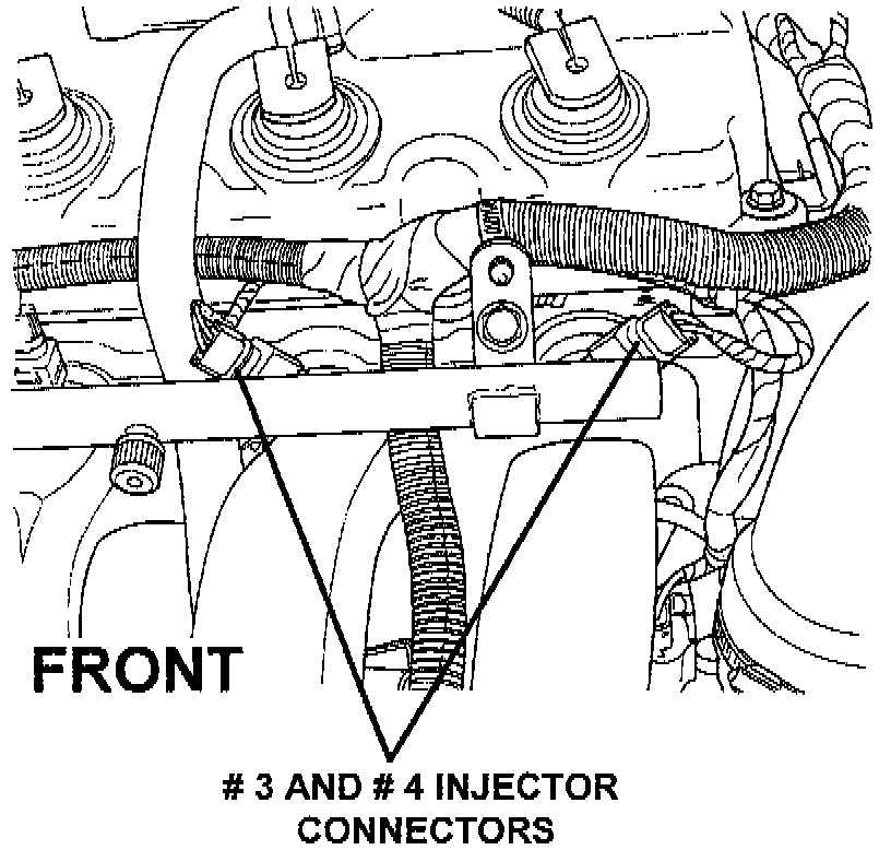 When servicing the engine, intake air duct or injectors, the number three and four injector connectors must be orientated at a 450 to 800 opposing angle. If the connectors are left in the 12:00 o'clock (straight up) position, the wiring may be chafed by the air intake duct resulting in an open circuit condition causing an engine miss. See illustration for proper connector orientation.