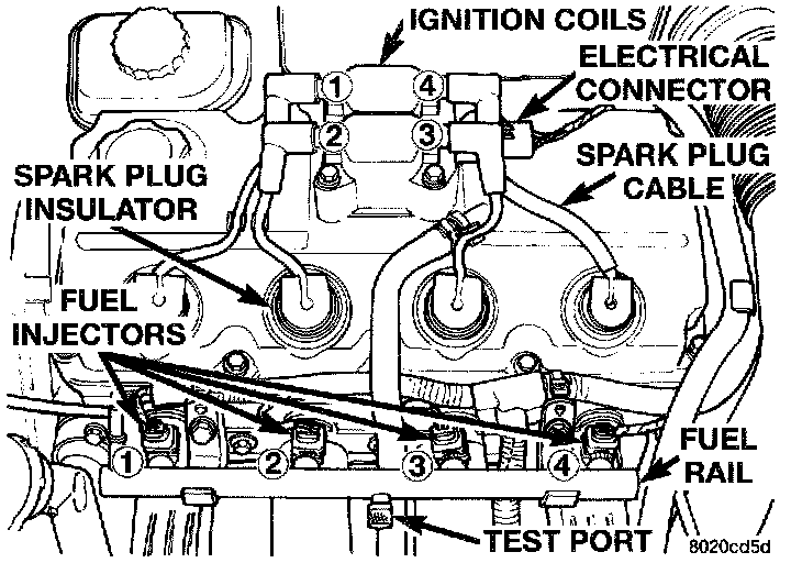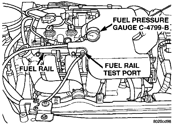 NOTE: The fuel system operates at approximately 331 kPa (48 psi). Check fuel system pressure at the test port on the fuel rail (Fig. 7).