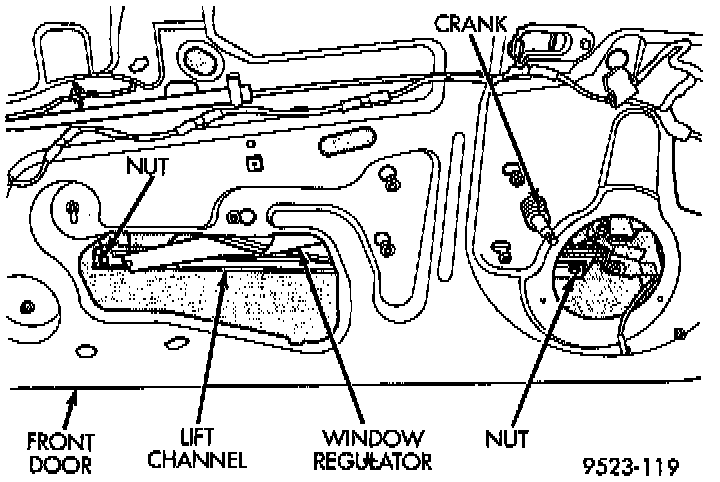 5. Remove bolts holding regulator lift channel to door glass.