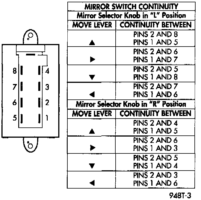 3. Using an ohmmeter, test for continuity between the terminals of the switch as shown in the Mirror Switch Test and RHD Power Fold Away Mirror Switch Test.