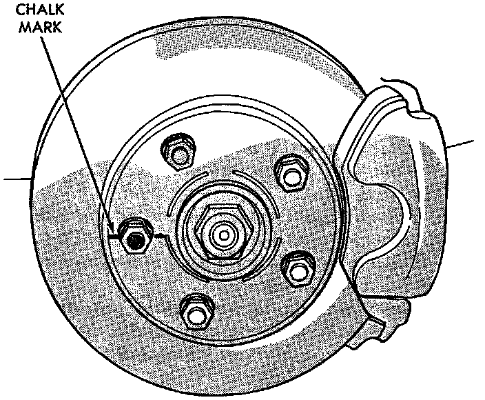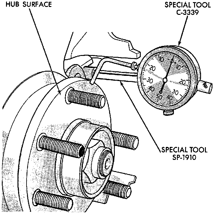 On vehicle rotor runout is the combination of the individual runout of the hub face and the runout of the rotor. (The hub and rotor runouts are separable). To measure runout on the vehicle, remove the wheel and reinstall the lug nuts tightening the rotor to the hub. Mount Dial Indicator, Special Tool C-3339 with Mounting Adapter, Special Tool SP-1910, or equivalents on steering arm. Dial indicator plunger should contact braking surface of rotor approximately one inch from edge of rotor. Check lateral runout (both sides of rotor) runout should not exceed 0.13 mm (0.005 inch). If runout is in excess of the specification, check the lateral runout of the hub face. Before removing rotor from hub, make a chalk mark across both the rotor and one wheel stud on the high side of runout so you'll know exactly how the rotor and hub was originally mounted. Remove rotor from hub. Install Dial Indicator, Special Tool C-3339 and Mounting Adapter, Special Tool SP- 1910, or equivalents on steering knuckle. Position stem so it contacts hub face near outer diameter. Care must be taken to position stem outside the stud circle but inside the chamfer on the hub rim. Clean hub surface before checking. Runout should not exceed 0.08 mm (0.003 inch). If runout exceeds this specification, hub must be replaced. Refer to Steering and Suspension. If hub runout does not exceed this specification, install rotor on hub with chalk marks two wheel studs apart. Tighten nuts in the proper sequence and torque to specifications. Finally, check runout of rotor to see if runout is now within specifications. If runout is not within specifications, install a new rotor or reface rotor, being careful to remove as little as possible from each side of rotor. Remove equal amounts from each side of rotor. Do not reduce thickness below minimum thickness cast into the unmachined surface of the rotor.