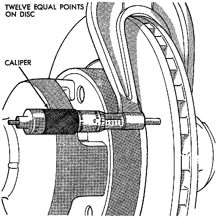 Thickness variation measurements of rotor should be made in conjunction with runout. Measure thickness of rotor at 12 equal points with a micrometer at a radius approximately 25 mm (1 inch) from edge of rotor. If thickness measurements vary by more than 0.013 mm (0.0005 inch) rotor should be removed and resurfaced, or a new rotor installed. If cracks or burned spots are evident, rotor must be replaced. Light scoring and/or wear is acceptable. If heavy scoring or warping is evident, the rotor must be machined or replaced.