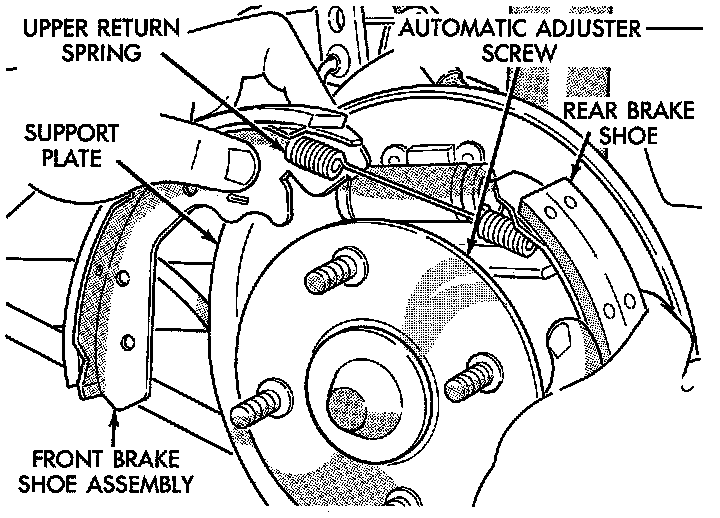 9. Remove front and rear brake shoe assemblies, upper return spring and automatic adjuster screw from brake support plate as an assembly.