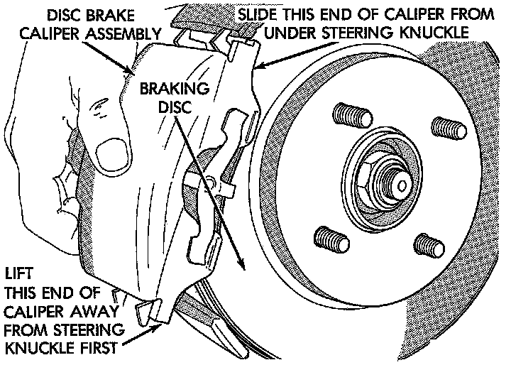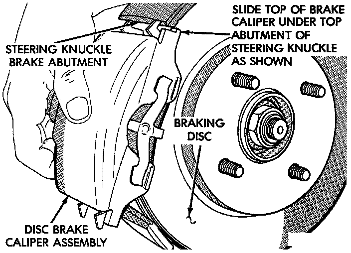 4. Remove caliper from steering knuckle, by first rotating free end of caliper away from steering knuckle. Then slide opposite end of caliper out from under machined abutment on steering knuckle.