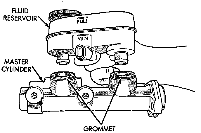 7. Lubricate reservoir mounting area with fresh clean brake fluid. Place reservoir in position over grommets. Seat reservoir into grommets using a rocking motion while firmly pressing down on fluid reservoir.