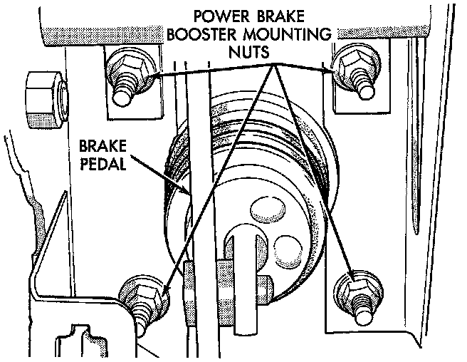 9. Position master cylinder on studs of power brake unit, aligning push rod on power brake vacuum booster with master cylinder push rod.
