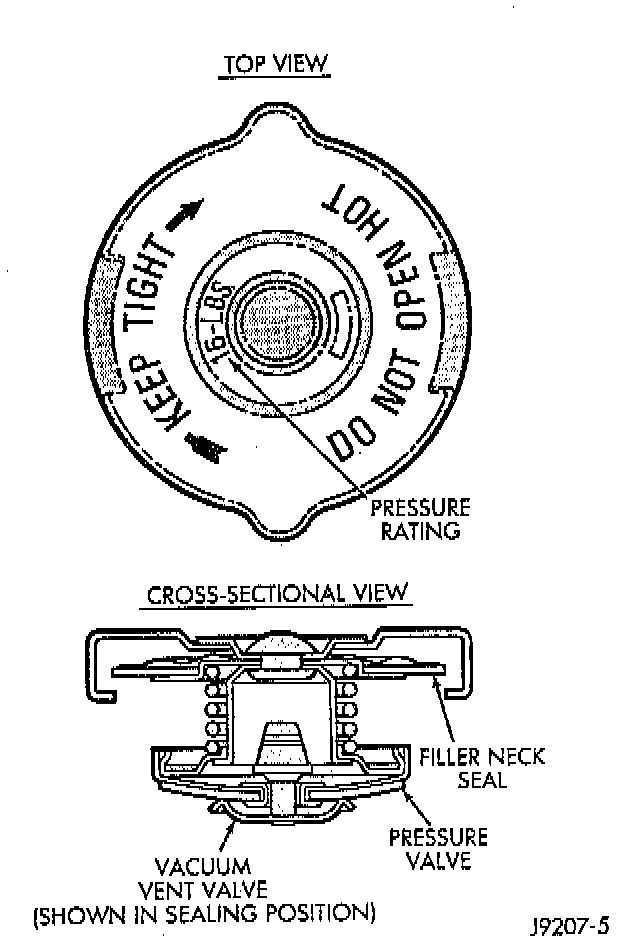 The cooling system is equipped with a pressure cap that releases pressure at some point within a range of 97 - 124 kPa (14 - 18 psi). The system will operate at higher than atmospheric pressure, which raises the coolant boiling point, allowing increased radiator cooling capacity.