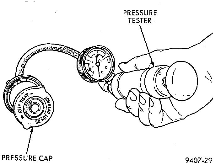 Dip the pressure cap in water; clean off any deposits on the vent valve or its seat, and apply the cap to end of radiator pressure tester. Working the plunger, increase the pressure to 104 kPa (15 psi) on the gauge. If the pressure cap fails to hold pressure of at least 97 kPa (14 psi), replace the cap.