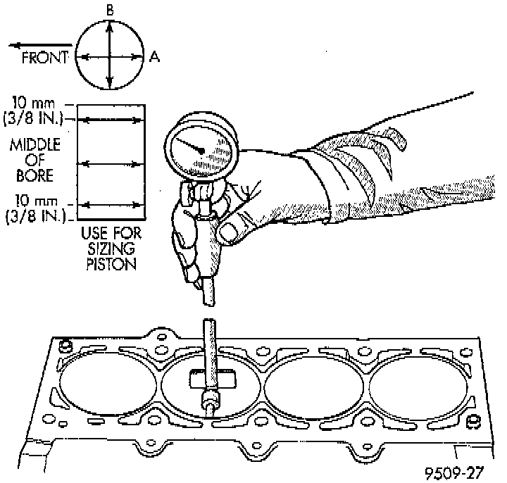 NOTE: Measure the cylinder bore at three levels in directions A and B. Top measurement should be 10 mm (3/8 inch) down and bottom measurement should be 10 mm (3/8 inch) up from bottom of bore.