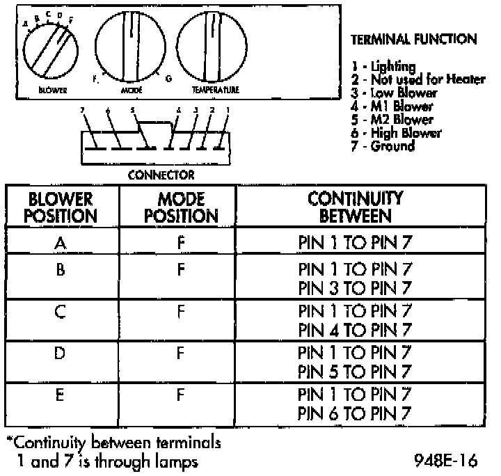 3. If the switch fails any part of the continuity test, other then Pin 1 to Pin 7, replace Heater A/C Control. If no continuity between Pin 1 to Pin 7 check the lamps, replace if necessary.
