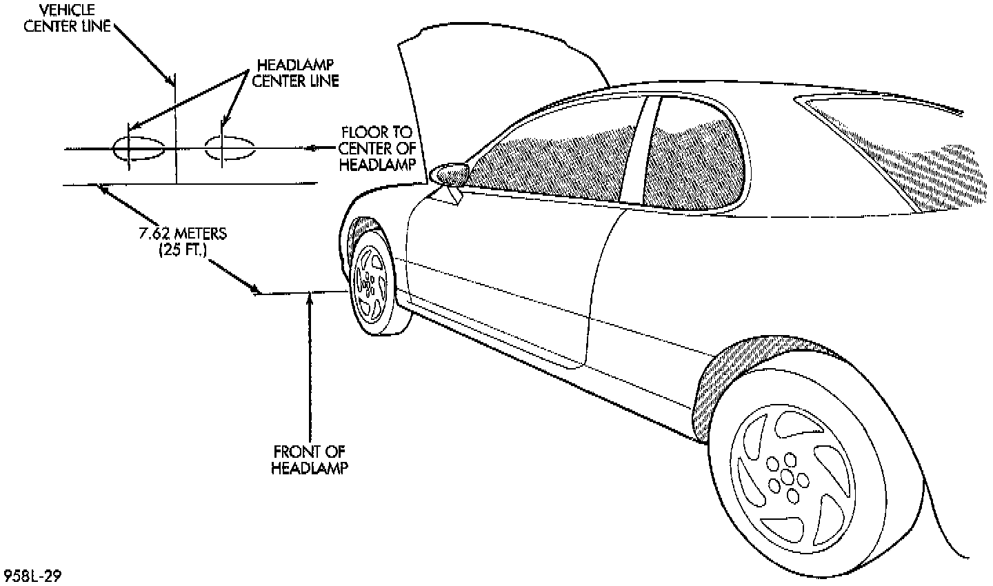 1. Position vehicle on a level surface perpendicular to a flat wall 7.62 meters (25 ft) away from front of headlamp lens.