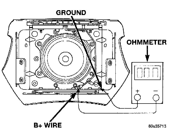 5. Using ohmmeter, connect one lead to the airbag module ground and the other lead to B+ wire.
