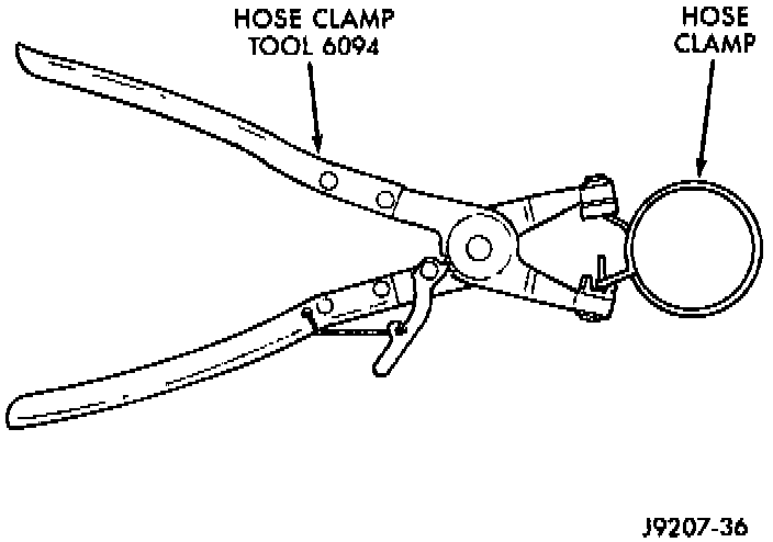 Spring type hose clamps are used in all applications. If replacement is necessary replace with the original Mopar equipment spring type clamp. The hose clamps are removed by using Special Tool 6094, or equivalent constant tension clamp pliers to compress hose clamp.