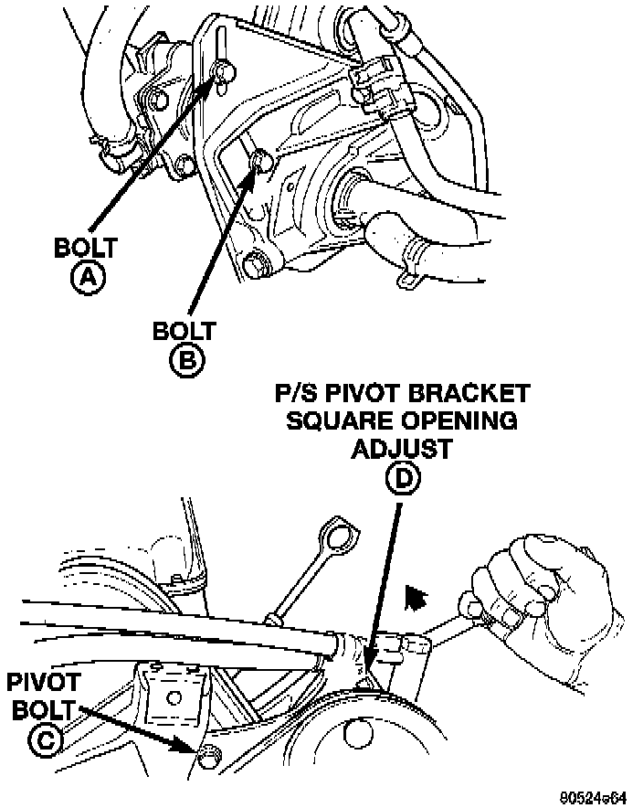 2. Using a 1/2" breaker bar, adjust belt tension by applying torque to the square hole "D" on the power steering pivot bracket. Adjust the tension as follows: