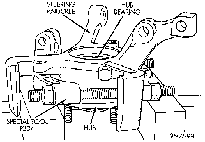 2. Install Bearing Splitter, Special Tool P334, or equivalent on the steering knuckle and hub/bearing assembly as shown to support steering knuckle when pressing out hub.