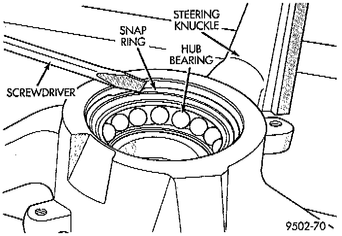 6. Using a screw driver, remove the snap ring retaining the hub bearing in the steering knuckle.