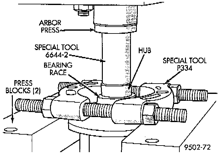 8. Install Bearing Splitter, Special Tool P334, or equivalent on hub so it is between the flange of the hub and the bearing race remaining on the hub. Place hub, bearing race and the bearing splitter in an arbor press as shown. Place Driver, Special Tool 6644-2, or equivalent on end of hub. Press the hub out of the bearing race.